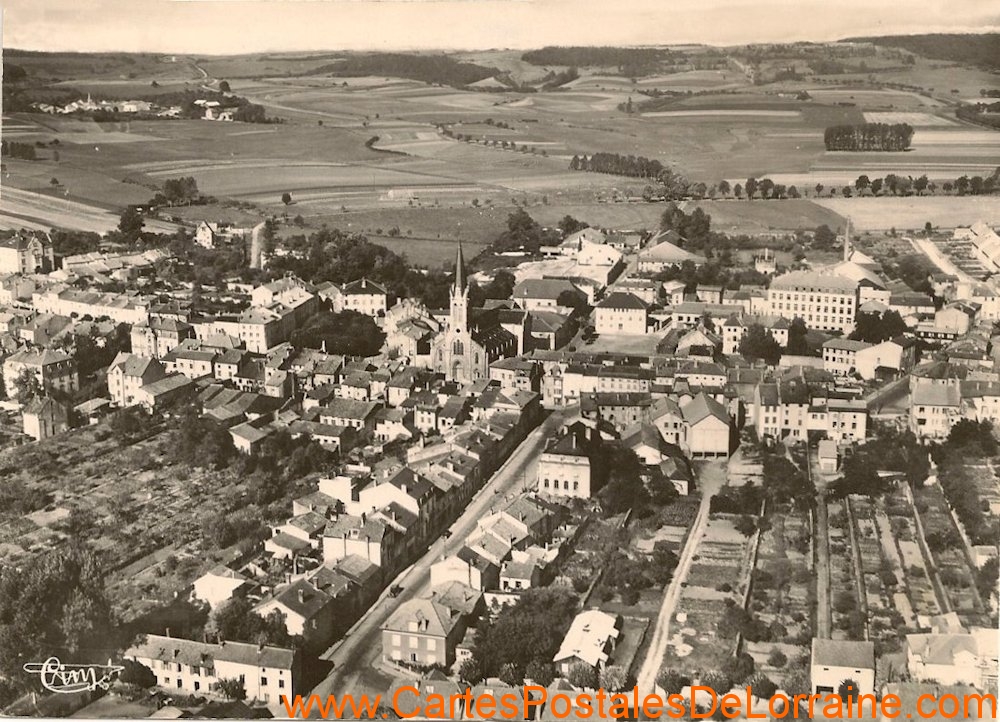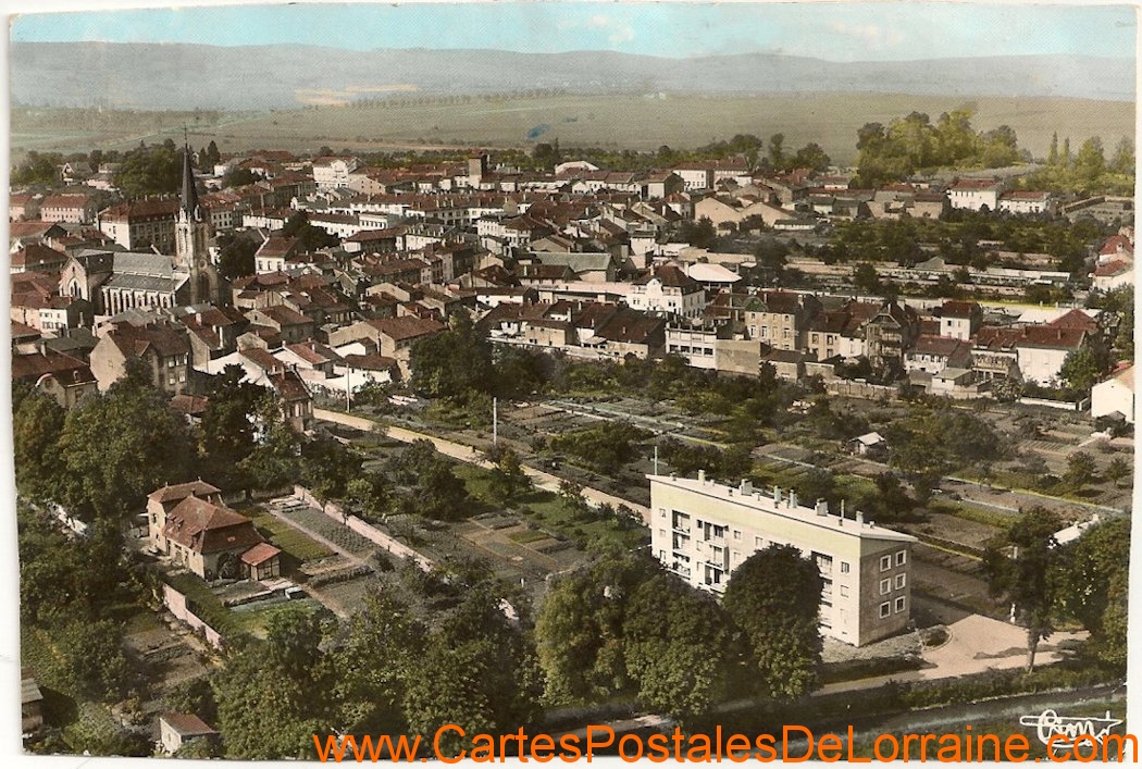 Cartes postales anciennes de Château-Salins (57170) - Vue Générales.Vues d'ensemble autour de 1960La rue Solvay mène au centre. L'église et, sur la droite, le gros bâtiment de l'école ménagère (Doctrine Chrétienne)